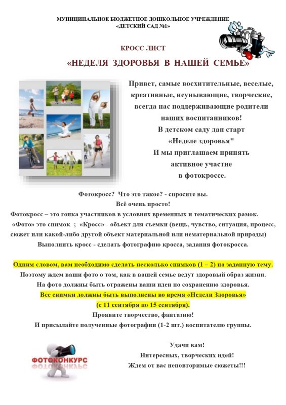 А вас, наши уважаемые родители, мы приглашаем принять участие в фотокроссе «Неделя здоровья в нашей семье». Ждём ваши фото о том, как в вашей семье ведут здоровый образ жизни.