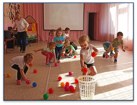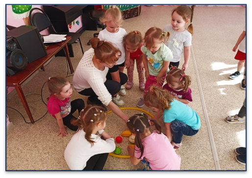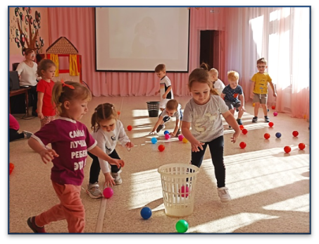 Затем поучаствовали в эстафете и помогли Зайке выбрать полезные продукты, в которых много витаминов.