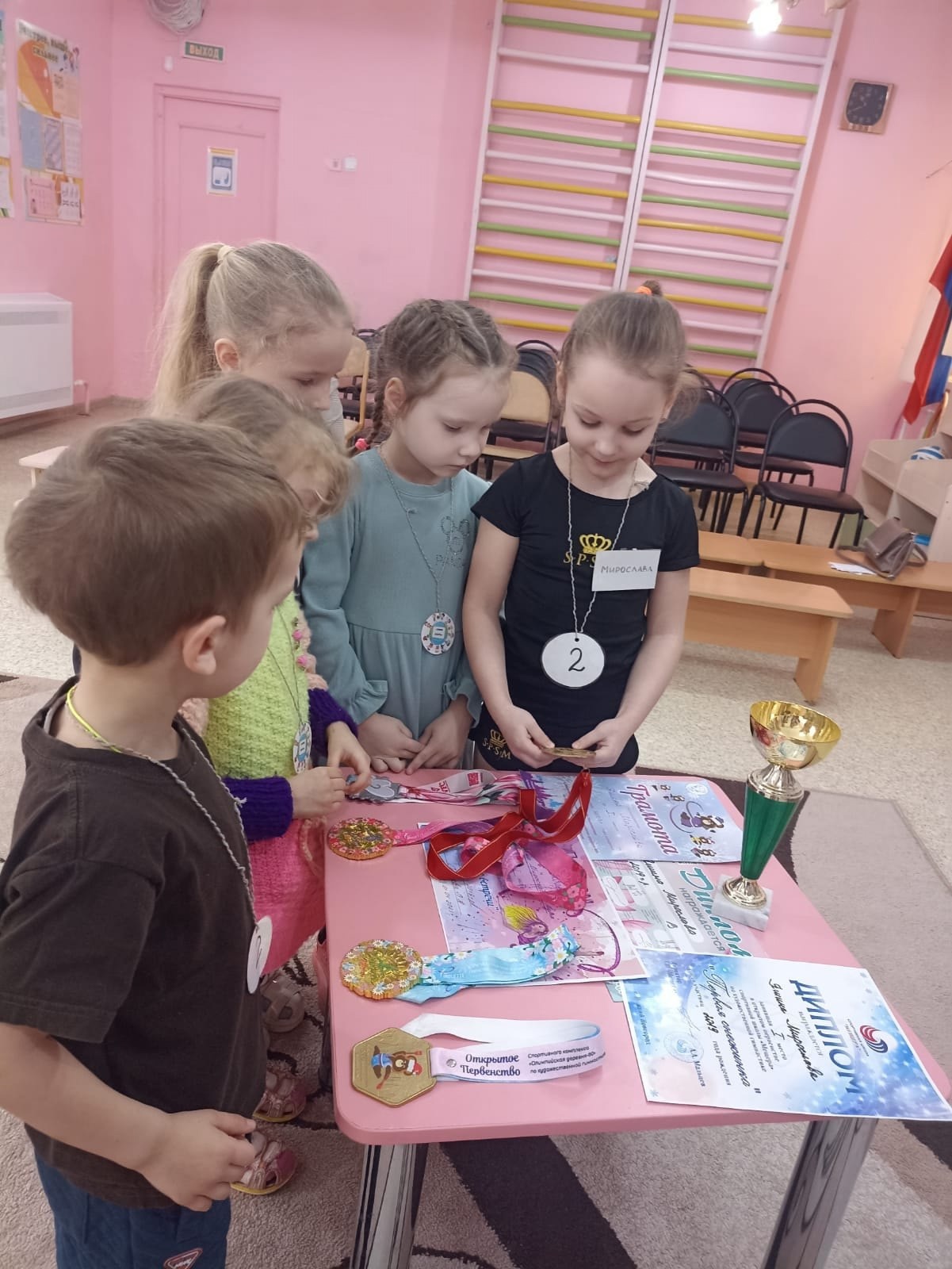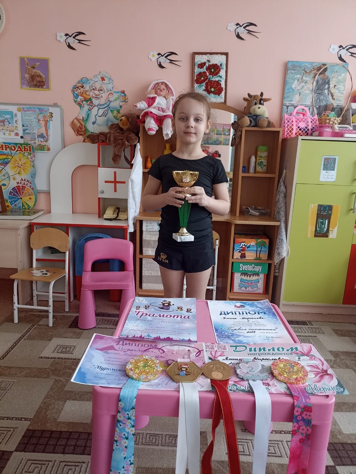 У нее много наград - грамот, дипломов с соревнований, различных турниров по художественной гимнастике. Она даже награждена кубком как абсолютная Победительница!!!