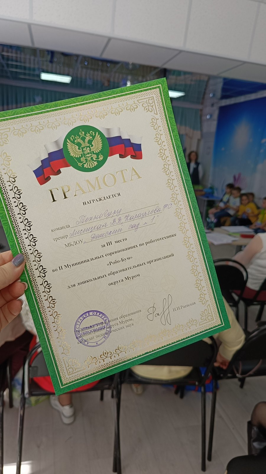 15 мая 2025 года команда нашего детского сада «Техно-Гуру» воспитанников группы компенсирующей направленности -Изъюрова Ева и Крявцов Артем- приняли участие в Муниципальных соревнованиях по робототехнике «Робо-Бум» среди 8 команд дошкольных образовательных организаций округа Муром и стали победителями, заняв почетное 3 место.